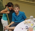 Forty-eight Haskell family members arrived at the Gettysburg Hotel Friday afternoon to be greeted by Louisa Stone and Edie Haskell at the registration table outside the Stevens Room. Louisa had made personalized name tags for everyone with the entire line of descent from Roger1, William1, or Mark1—each brother having a unique color scheme. The front of the badge contained generations 1 and 2 at the top and the member’s name and parent name at the bottom. The back of the badge contained all of the intermediate generations.